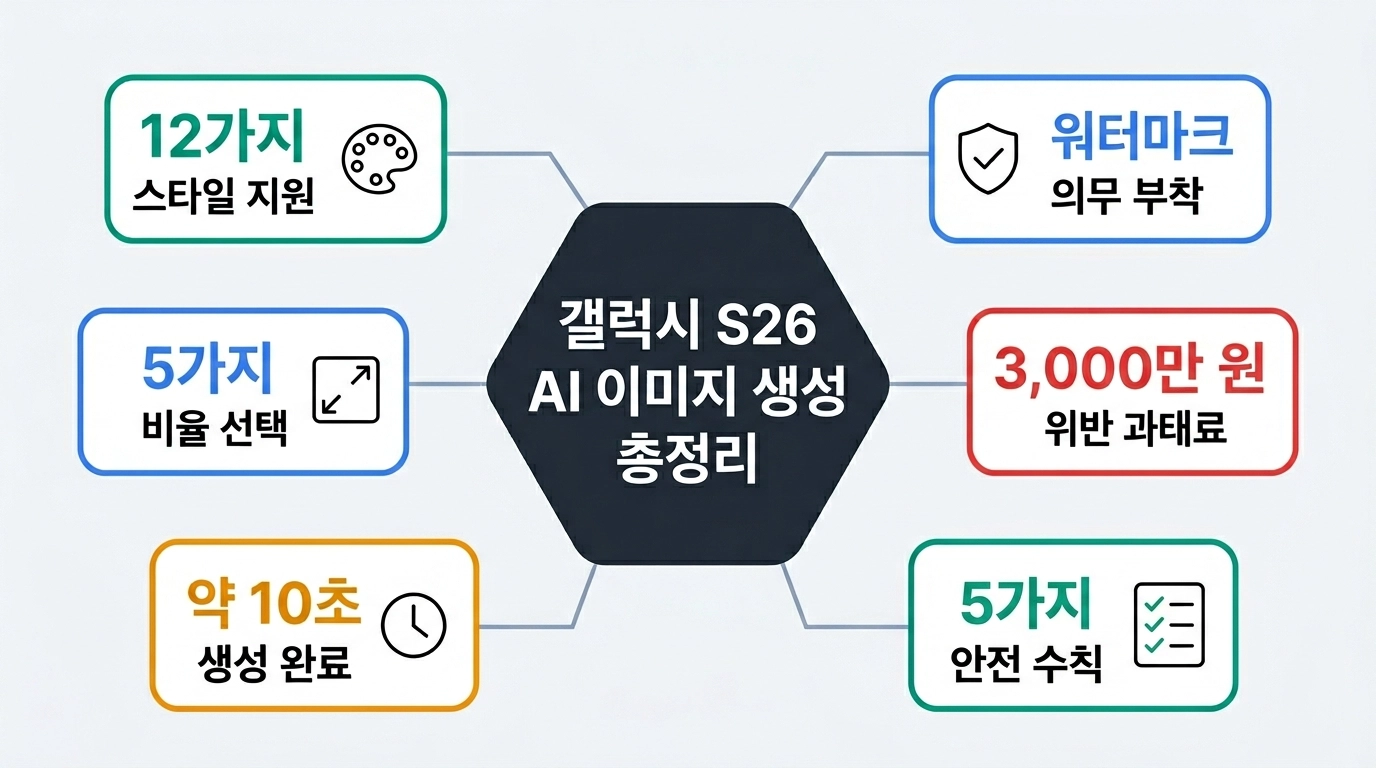 둘째, AI 워터마크를 의도적으로 제거하지 마세요. 갤럭시 S26은 AI 생성 이미지에 워터마크를 자동 삽입하는데, 이를 제거하면 AI 생성물임을 숨기는 행위가 되어 향후 법적 문제가 될 수 있어요.